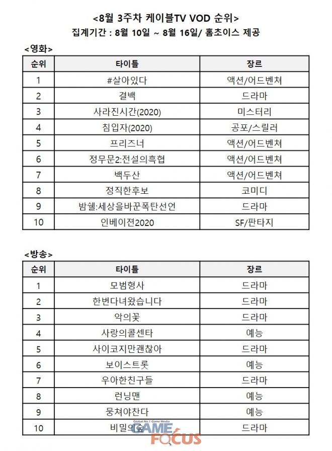 (주)홈초이스가 발표한 LG헬로비전, Btv 케이블, 딜라이브, CMB, 현대HCN 등 전국 케이블TV의 '8월 3주차 영화 · 방송 VOD 순위'에 따르면, '#살아있다'가 영화 VOD 순위 1위를 차지했다.