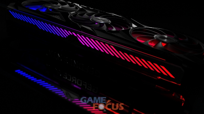 ROG Strix GeForce RTX 30시리즈는 NVIDIA의 Ampere 아키텍처가 가진 성능을 끌어내기 위해 새롭게 설계되었다. 금속 재질의 슈라우드에 Axial-tech가 적용된 3개의 팬이 장착되어 중앙 팬은 GPU 히트 스프레더에 직접적으로 차가운 공기를 공급하며, 양 사이드에 위치한 두 개의 팬은 보다 효율적인 공기 흐름을 형성해 팬 사이의 난류를 최소화한다.