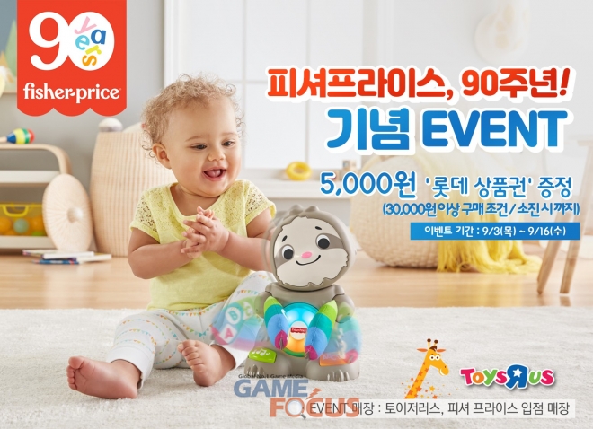 피셔프라이스가 입점되어 있는 토이저러스 매장에서 피셔프라이스 완구를 3만 원 이상 구매한 고객에게 롯데상품권 5천 원을 증정하고 다양한 신제품도 선보일 예정이다. 상품권 증정 행사는 9월 3일부터 16일까지며 매장별 상품권 소진 시 자동 종료된다.