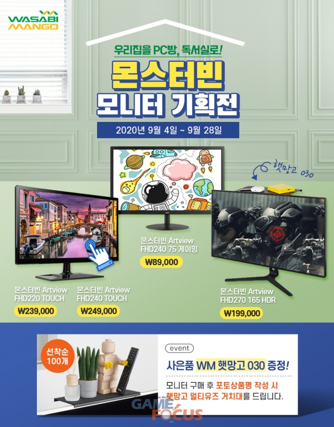 행사모델은 '몬스터빈 시리즈'의 게이밍 라인업 ARTVIEW FHD240 75 게이밍, ARTVIEW FHD270 165 HDR 2종과 터치모니터인 ARTVIEW 220, 240 TOUCH 2종이다.