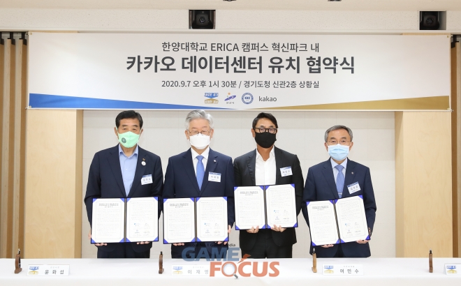 카카오는 7일 경기도청에서 이재명 경기도지사, 윤화섭 안산시장, 한양대 김우승 총장, 카카오 여민수 대표이사 등이 참석한 가운데 안산시, 한양대 에리카 캠퍼스와 함께 ‘카카오 데이터센터 및 산학협력시설 건립을 위한 양해각서’를 체결했다고 밝혔다.