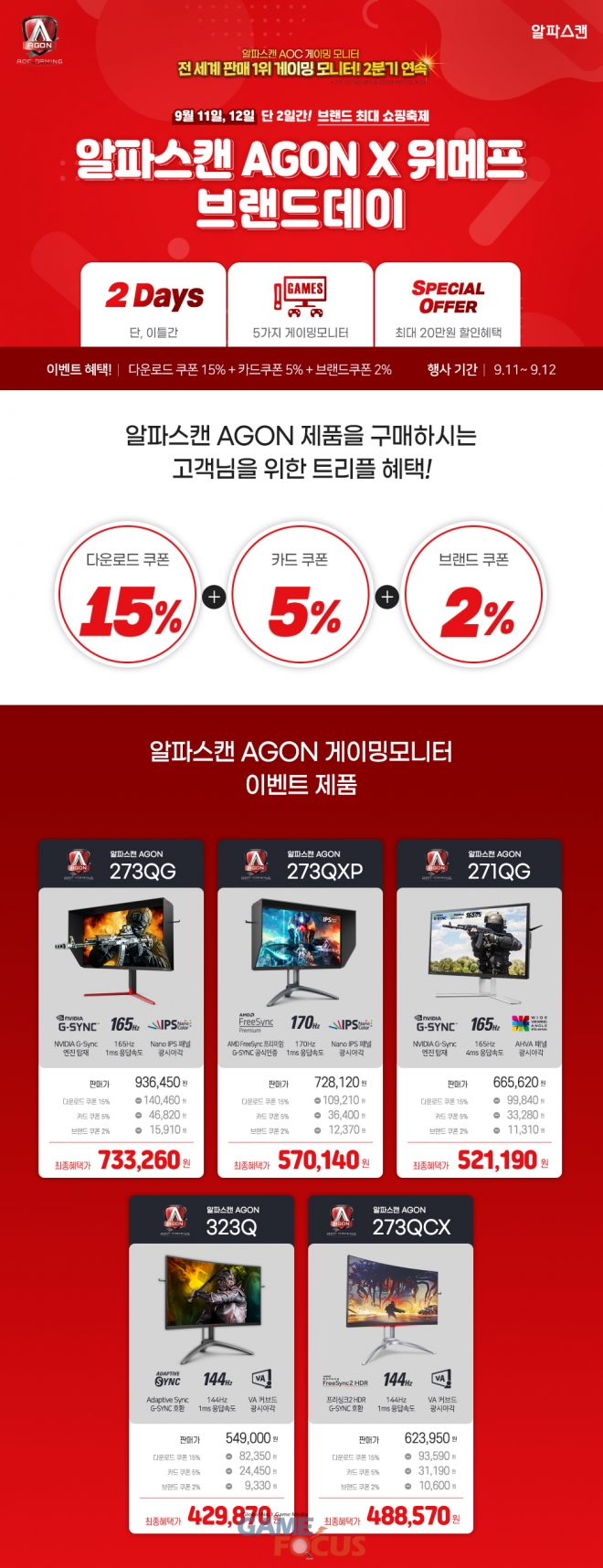 (주)알파스캔 디스플레이가 AOC 프로페셔날 게이밍 브랜드 AGON(에이건)의 인기 제품에 대해 브랜드데이 특가 행사를 진행한다고 밝혔다. 행사 대상 제품은 AGON 273QG, 273QXP, 271QG, 323Q, 273QCX 5종이다.