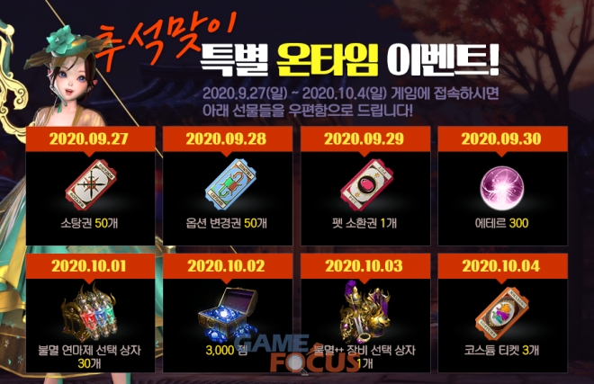 '다크어벤저 3'에서는 9월 27일부터 10월 4일까지 '펫 소환권', '불멸++ 장비 선택상자' 등 고급 아이템을 매일 지급하는 '추석 맞이 특별 온타임 이벤트'를 진행하며, 같은 기간 특정 시간에 스테이지 골드를 두 배 획득할 수 있는 '핫타임 이벤트'를 실시한다.