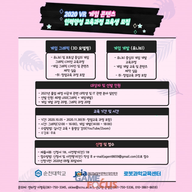 전라남도 소재 대학 졸업자(2020년 졸업 예정자 포함) 및 IT 관련 분야 일반인(전남도민) 누구나 지원 가능하며 교육과정은 전액 무료로 진행된다. 선발된 교육생은 기업체와 연계해 현장실습 기회를 얻을 수 있으며, 게임 기업에 취업을 지원할 예정이다.