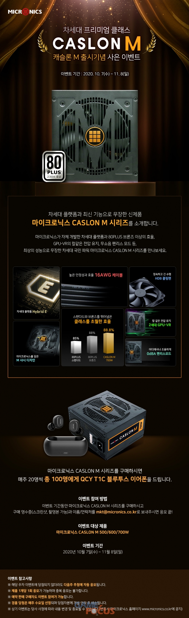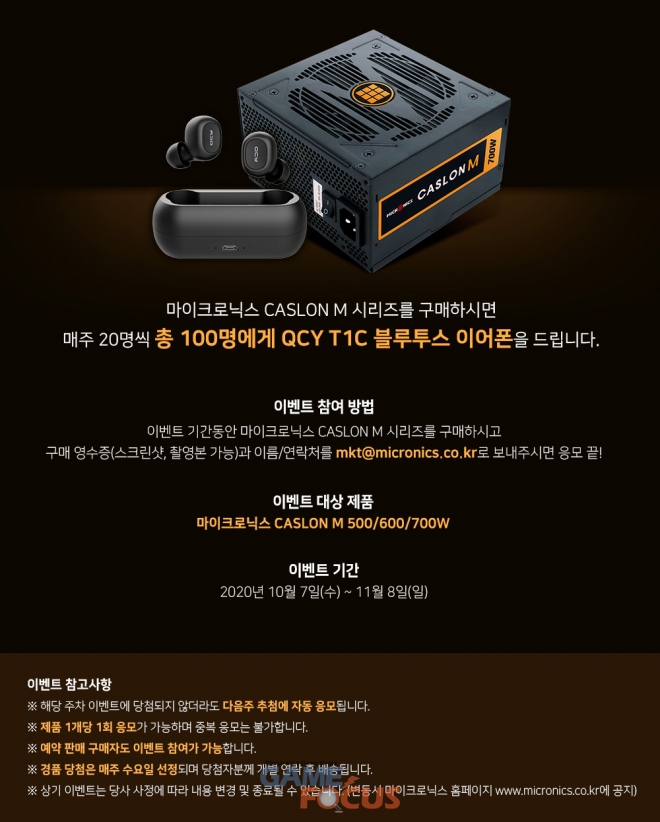 한편, 마이크로닉스는 캐슬론 M 파워서플라이 출시를 기념, 오는 11월 8일까지 구매 이벤트를 진행한다.