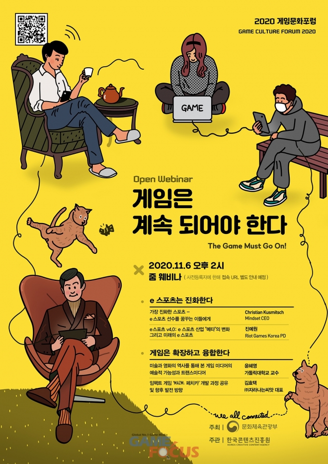 문화체육관광부(장관 박양우)와 한국콘텐츠진흥원(원장 김영준, 이하 콘진원)은 ‘2020 게임문화포럼 오픈웨비나(Webinar, 웹 세미나)’를 화상회의 플랫폼 줌(Zoom)으로 오는 6일 개최한다.