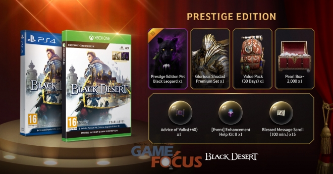 '프레스티지 에디션'은 검은사막 콘솔 첫 번째 리테일 패키지로 북미/유럽/아시아 권역에 온라인 및 오프라인 스토어에서 구매할 수 있다. 북미 유럽은 독일 미디어 그룹 코치 미디어(Koch Media)를 통해, 아시아 지역은 에이치투 인터렉티브(H2 INTERACTIVE)가 유통과 판매를 맡았다.