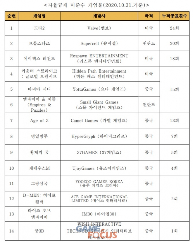한국게임정책자율기구(이하 ‘기구’)는 한국게임산업협회(이하 ‘협회’)에서 시행하고 있는 강화된 '건강한 게임문화 조성을 위한 자율규제 강령(이하 강령)'에 따라 미준수 게임물을 2020년 11월 23일 24차 공표하였다.