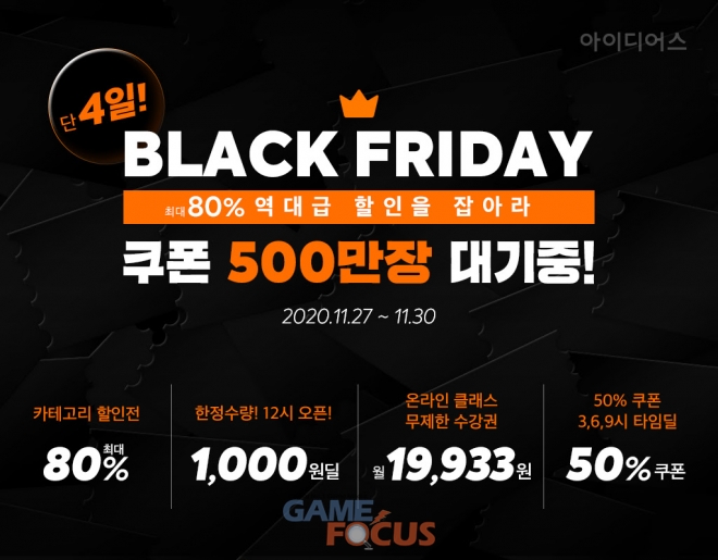 아이디어스는 블랙프라이데이 프로모션을 위해 아이디어스 작품과 온라인 클래스를 이용할 수 있는 총 500만장의 쿠폰을 발급할 계획이다. 쿠폰은 모든 고객이 참여할 수 있는 100% 당첨 룰렛 이벤트와, 10만원 이상 구매 고객이 참여할 수 있는 럭키박스 이벤트를 통해 지급되며 최대 100만원권 쿠폰이 제공된다.
