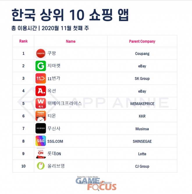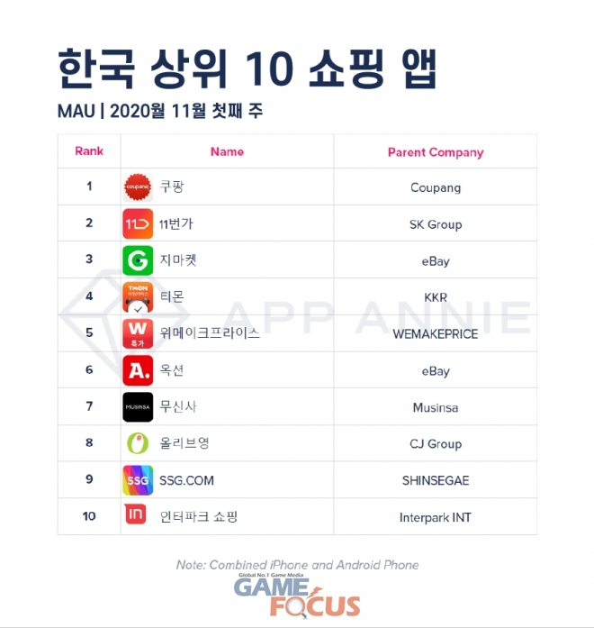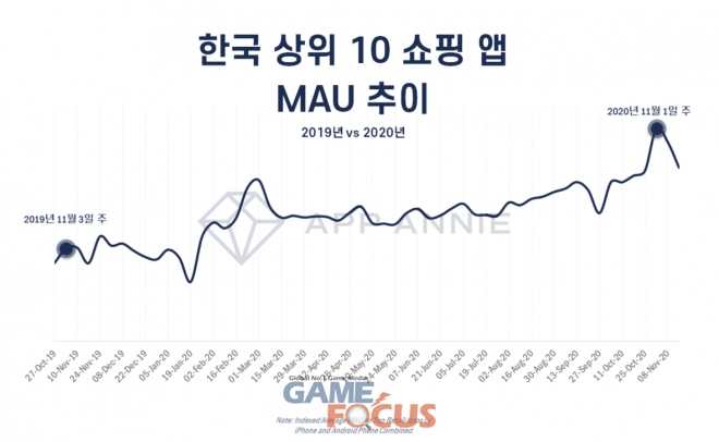 모바일 데이터 및 분석 플랫폼인 앱애니(App Annie)가 코리아 세일 페스타 기간 첫 주 동안 행사에 참가하거나 자체 블랙프라이데이 프로모션을 전개한 상위 쇼핑앱을 선정, 이용 시간 및 MAU 랭킹을 발표했다.