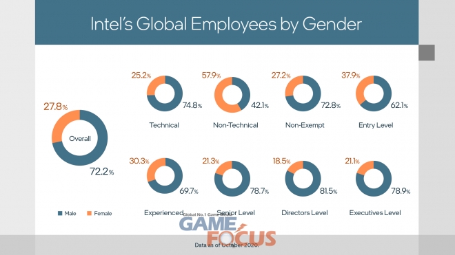 올해 인텔은 일부에서는 개선이 있었고, 다른 부분에서는 기대에 미치지 못했다. 전세계적으로 인텔의 많은 여성 직원들이 경력직 및 고위직에 분포되었고, 라틴 계열 및 참전용사(veteran) 비율이 괄목할만한 성장을 이뤘다. 하지만 미국내 전체 여성 임직원의 숫자는 감소했다.