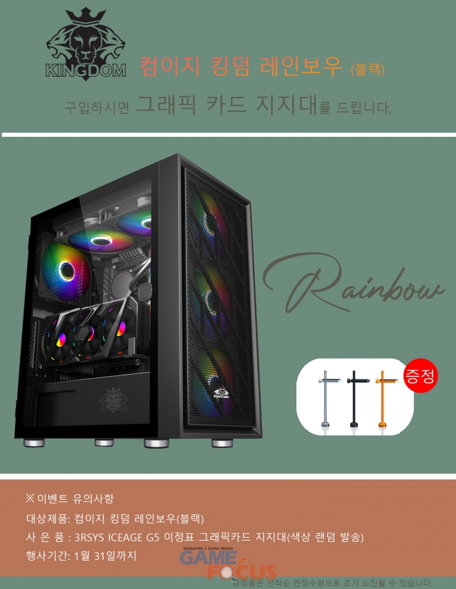 1월 31일까지 진행되는 이번 그래픽 카드 지지대 사은품 증정 행사는 킹덤 레인보우 블랙 구매시 같이 제공되며, 사은품 소진 시 조기 마감될 수 있다.