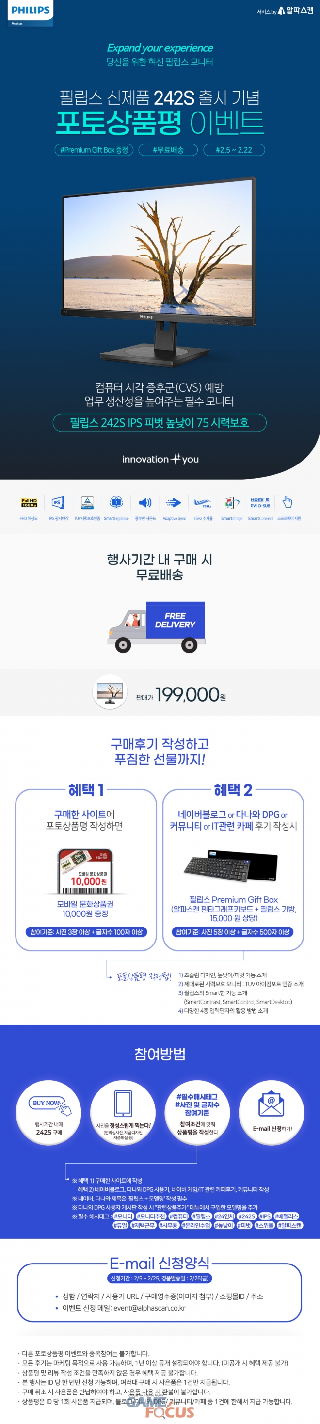 알파스캔 측은 “242S는 업무의 생산성과 편안한 업무 환경을 위한 필수적인 기능을 담은 모니터로 노트북 연결, 재택근무 및 원격수업용으로 적합하다”며 “초극강의 보더리스 디자인과 IPS 패널을 통해 넓고 깨끗한 화면을 경험할 수 있으며, TUV 공식 인증을 받은 시력보호 기능으로 눈의 피로를 줄여줄 수 있다”고 밝혔다.
