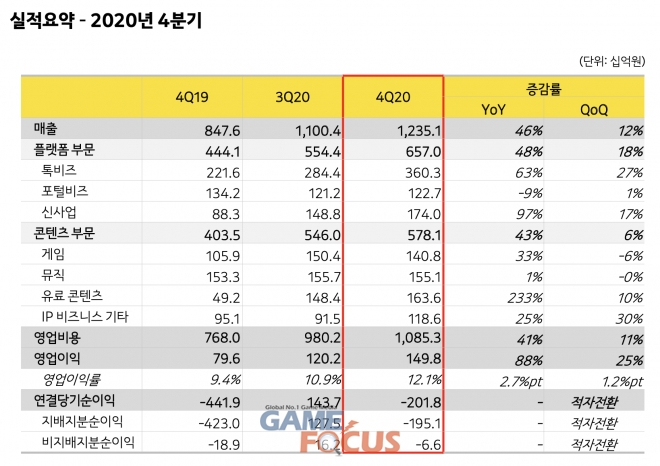 2020년 4분기 연결 매출은 전분기 대비 12%, 전년 동기 대비 46% 증가한 1조2,351억원이며, 영업이익은 전분기 대비 25%, 전년 동기 대비 88% 성장한 1,498억원을 기록했다.