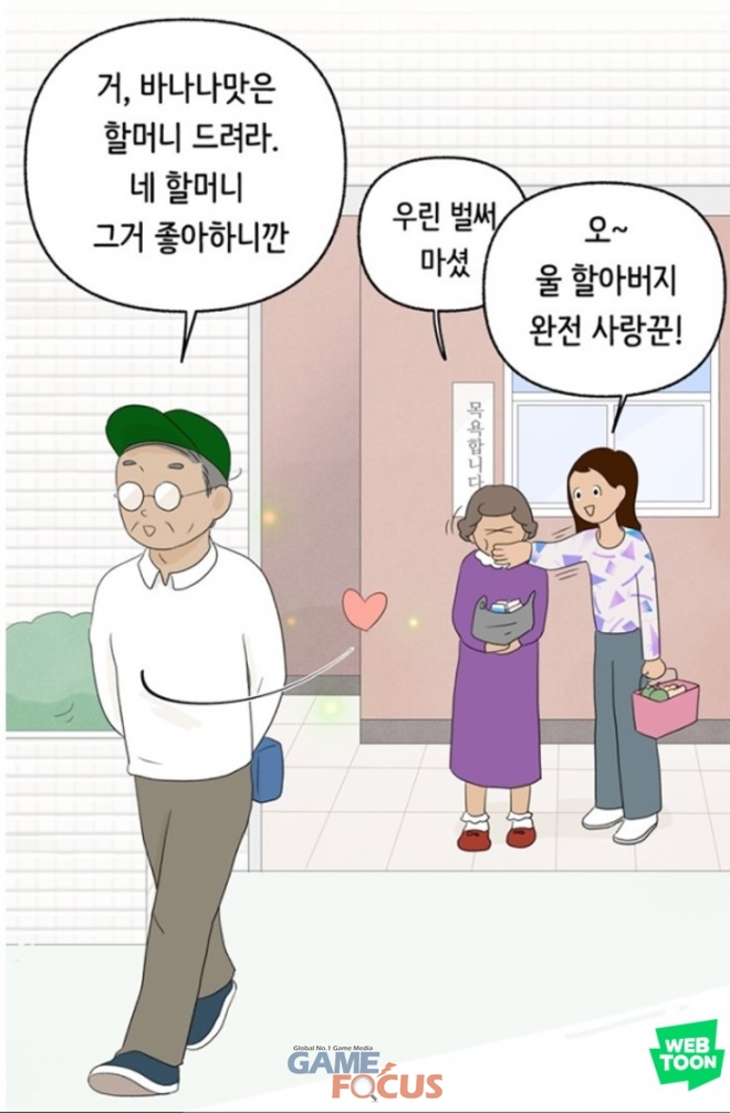 할머니와 손녀가 함께 목욕탕에 가거나, 스마트폰을 산 할아버지와 손녀가 처음으로 문자 메시지를 주고받는 모습 등 조부모와 손녀가 함께하는 순간들을 다양한 에피소드로 따뜻하게 담아냈다. 독자들은 웹툰 내용에 깊이 공감하며 “나도 할머니랑 저랬던 적이 있었는데, 내 이야기를 그린 것 같다”, “우리 할아버지, 할머니가 보고 싶다” 등의 반응을 보이고 있다.