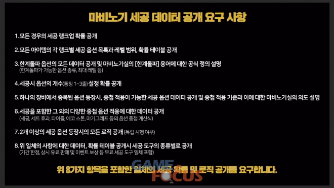 뿐만 아니라 특정 아이템에 특정 '세공' 옵션이 적용되지 않거나, 사용이 불가능한 '세공' 옵션이 특정 아이템에 부여되거나, 종족 전용 아이템에 해당 종족에 맞지 않는 옵션이 등장하는 등 확률 공개 외에도 '세공'과 함께 게임을 하며 경험했던 각종 다양한 오류에 대해서도 '마비노기' 유저 대표 측의 날카로운 질문이 계속됐다.