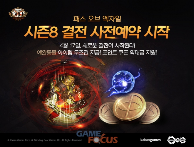 새로운 콘텐츠 업데이트로 무장한 시즌 8 '결전'은 4월 17일(토) 오픈 예정이며, 오늘부터 시즌 오픈 전까지 카카오톡에서 '패스 오브 엑자일 톡채널' 채널 추가 후 사전 예약에 참여한 모든 신청자에게 게임 내 아이템인 애완동물 쿠폰을 지급한다.
