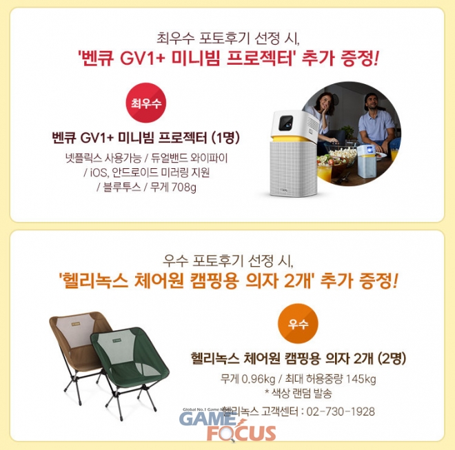벤큐가 4월 한 달 간 벤큐 모니터를 구입하고 포토후기를 작성한 모든 분들에게 모바일 문화상품권(1만원권)을 증정하고, 최우수 후기로 선정된 1명에게는 휴대성과 편의성을 갖춘 벤큐 미니빔 프로젝터 GV1+를, 우수 후기로 선정된 2명에게는 헬리녹스 체어원 캠핑용 의자 2개를 추가로 증정한다.