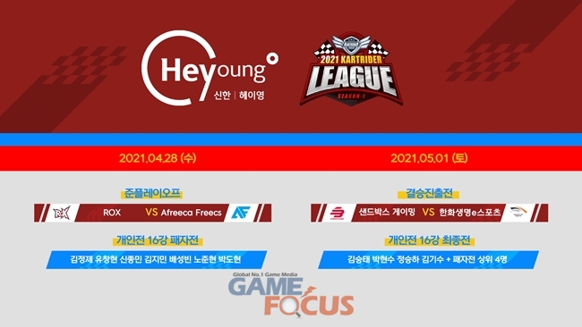 아프리카TV가 28일과 5월 1일 오후 6시부터 서울 대치동 아프리카 프릭업 스튜디오에서 '2021 신한은행 Hey Young 카트라이더 리그 시즌1' 준플레이오프와 결승 진출전, 개인전 16강 패자전과 최종전 경기를 생중계한다.