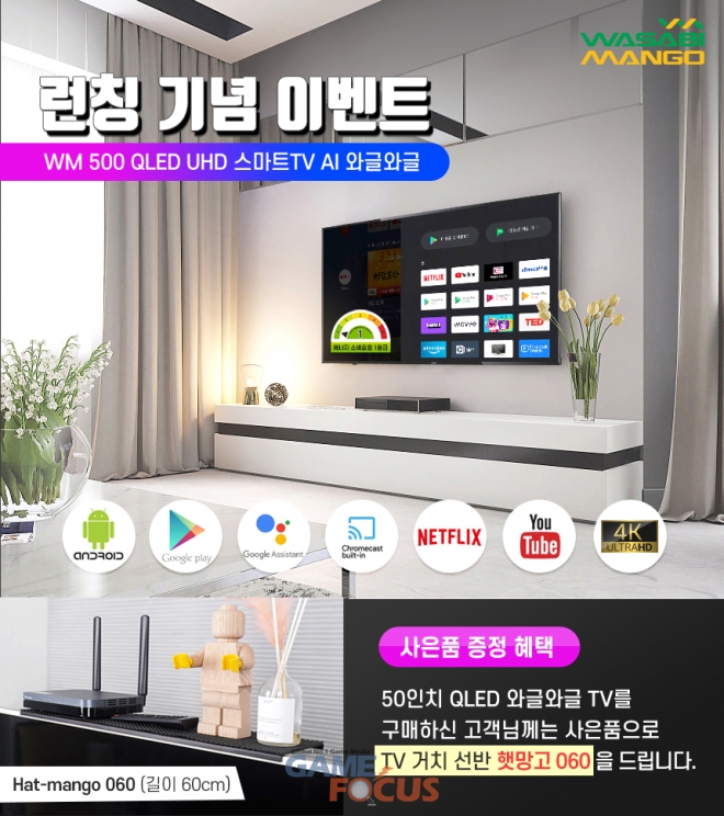 와사비망고(대표 김환준)가 QLED를 탑재한 2021년형 구글 안드로이드 스마트TV 'WM 500 QLED UHD 스마트TV AI 와글와글'을 공식 출시한다. 출시를 기념해 구매자 대상으로 TV 거치대 '햇망고060' 증정 이벤트를 진행한다.
