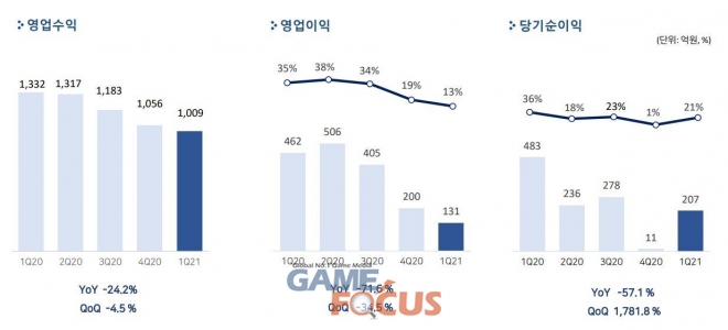 전분기 대비 매출과 영업이익이 각각 4.5%, 34.5% 감소했다. 2월말 검은사막 북미 유럽 지역 직접 서비스 이후 약 한 달만의 판매액 약 200억원을 달성했다. 북미 유럽 서비스 역대 최대 매출을 기록했지만 회계상 매출 이연으로 실제 판매액의 46% 수준만 1분기에 반영됐다. 인건비도 인원 증가 및 연봉 조정으로 전분기 대비 11% 증가했다.