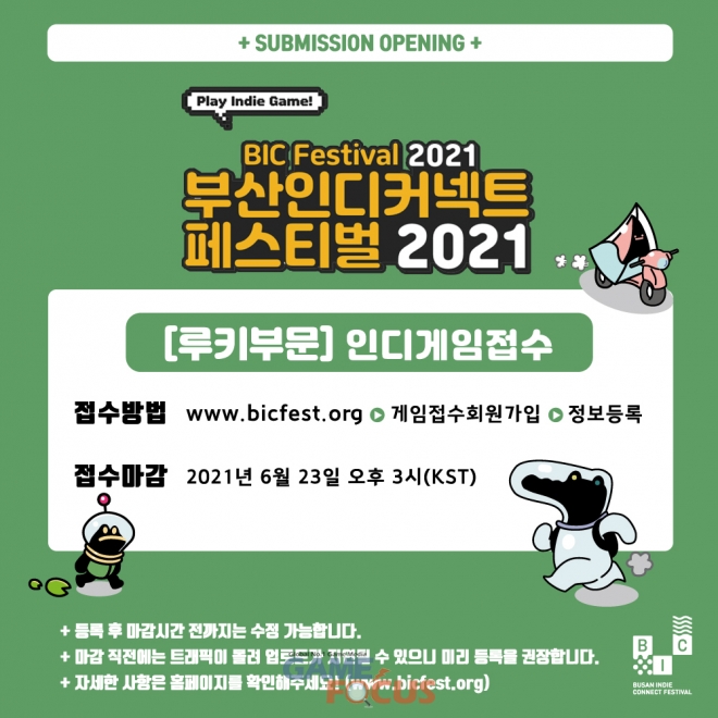루키부문의 접수 기간은 5월 21일부터 6월 23일까지다. 스스로를 인디게임 개발자라고 자각하는 만 14세 이상 25세 이하(학생 또는 25세 이하의 미취업자) 개인 또는 단체라면 누구나 'BIC 페스티벌' 공식 홈페이지에서 신청할 수 있다.