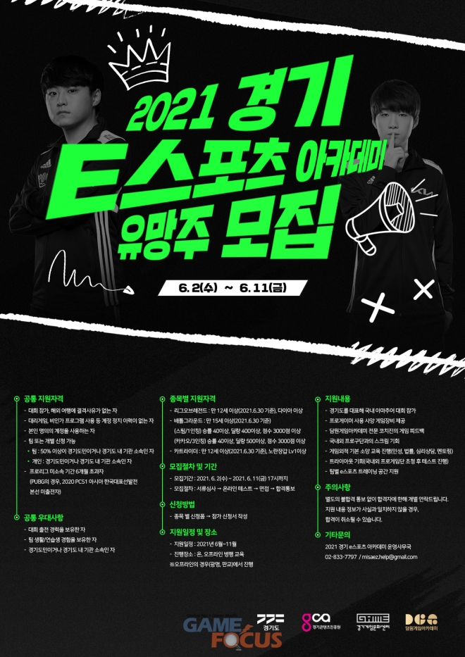 종목별 신청자격은 ▲리그 오브 레전드: 다이아몬드 티어 이상 달성한 만 12세 이상 ▲배틀그라운드: (스팀/1인칭) 승률 40이상, 딜량 400이상, 점수 3000점 이상, (카카오/3인칭) 승률 40이상, 딜량 500이상, 점수 3000점 이상 달성한 만 15세 이상 ▲카트라이더: 노란장갑 Lv1 이상 달성한 만 12세 이상이다.