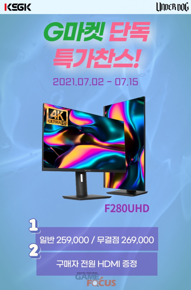 '언더독 F280UHD 피벗 모니터'를 G마켓 단독 특가로 만나볼 수 있으며 해당행사는 7월15일까지 진행된다. 정보는 판매페이지에서 확인 가능하다.