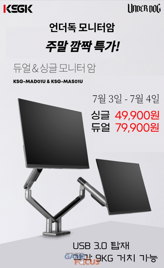 경성글로벌코리아(대표 김준길)의 모니터 브랜드 언더독이 모니터암 신제품 'MAS01U, MAD01U' 싱글, 듀얼 모니터암 각 2종에 대해 주말 특가 판매를 실시한다.