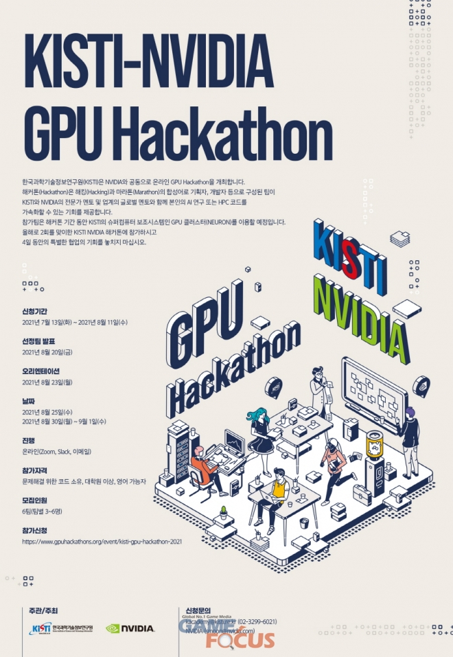엔비디아(CEO 젠슨 황)가 한국과학기술정보연구원(KISTI)과 함께 'KISTI-NVIDIA GPU 해커톤'을 오는 8월 25일부터 9월 1일까지 온라인으로 개최한다고 밝혔다. 7월 26일부터 27일까지 KISTI 슈퍼컴퓨터 사용자 50명을 대상으로 진행되는 'KISTI GPU 부트캠프'에 이어 'KISTI-NVIDIA GPU 해커톤'은 오픈 이벤트 형식으로 개최되며, 현재 참가자를 모집 중이다.