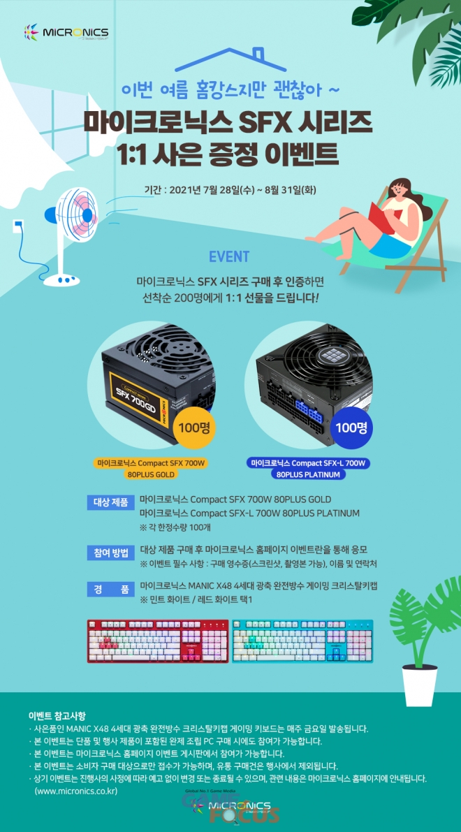 8월 31일까지 진행되는 이벤트는 마이크로닉스의 고성능 소형 파워서플라이를 알리고, 코로나-19 여파로 사회적 거리두기가 지속되는 상황 속에서 안정성을 갖춘 PC 시스템과 게이밍 키보드로 여름을 신나게 지낼 수 있기를 바라는 마음에서 기획되었다. 대상 제품은 '마이크로닉스 컴팩트 SFX 700W 80 PLUS GOLD'와 '컴팩트 SFX-L 700W 80 PLUS PLATINUM' 등 두 가지이며, 각각 100대씩 한정 수량으로 준비됐다.