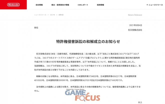 닌텐도가 금일(4일) 공식 홈페이지를 통해 주식회사 코로프라와의 특허권 침해 금지 소송에 대해 화해하기로 합의했음을 발표했다.