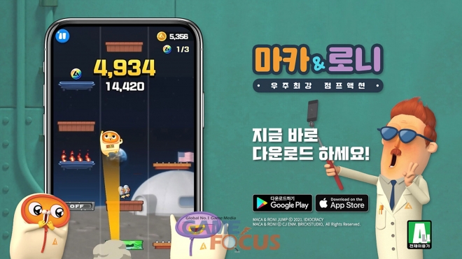 신작 모바일게임 ‘마카앤로니: 우주최강 점프액션’(이하 마카앤로니 점프)은 유튜브, 틱톡 등에서 인기를 끌고 있는 투니버스의 넌버벌 슬랩스틱 코믹 애니메이션 ‘마카앤로니’ IP를 기반으로 한 리듬 액션 점프 게임이다. CJ ENM 애니메이션사업부와 경기콘텐츠진흥원이 주관하는 ‘국산 IP의 모바일 게임화’ 제작 지원사업을 통해 탄생했으며, 해당 지원사업에 선정된 기업 이디오크러시(대표:김성기)에서 개발을 진행했다. 현재 전세계 서비스 중으로 출시 초반부터 유저들에게 호응을 얻고 있다.