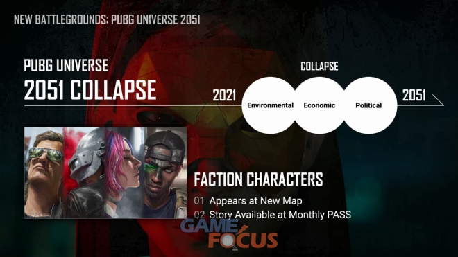 뿐만 아니라 '뉴 스테이트'는 '펍지(PUBG)' 세계관을 계승하여 새로운 이야기를 담아냈다. 2051년 근 미래, 중앙 정부의 통제력이 사라져 무정부 상태인 미래를 배경으로 다양한 세력들이 갈등을 빚고 있는 도시 '트로이'가 배경이다. '뉴 스테이트'의 이야기는 매달 공개되는 각 팩션 등장인물들과 스토리 미션을 통해 밝혀질 예정이다.