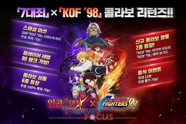 넷마블(대표 권영식, 이승원)이 모바일 RPG '일곱 개의 대죄: GRAND CROSS'(이하 일곱 개의 대죄: 그랜드 크로스, 개발사 넷마블F&C)에 두번째 '더 킹 오브 파이터즈 '98'(THE KING OF FIGHTERS '98) 콜라보레이션 업데이트를 실시했다.