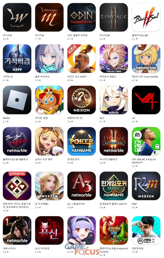 11위부터 30위 사이에서는 업데이트에 따른 소폭의 순위 변화만 보이고 있다. '쿠키런: 킹덤'과 '원신', 'V4' 등이 순항하는 한편, '바람의나라: 연'은 지난 주 27위에서 이번 주 13위로 순위가 대폭 상승했다. '심포니 오브 에픽' 또한 지난 주 15위, 이번 주 17위로 무난한 성적표을 보여주고 있다.