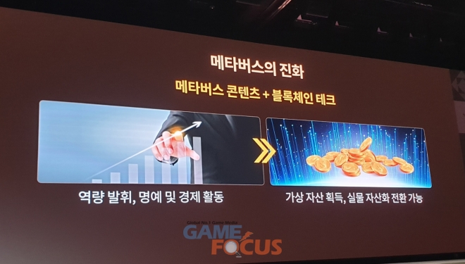 이어서 "게임은 메타버스 구현의 토대로, 게임에서 메타버스의 다양한 콘텐츠를 구현해 뒀고 기술도 있다. 기술, 경험면에서 충분히 구현 가능한 수준에 와 있다"며 "넷마블이 생각하는 메타버스는 메타버스 콘텐츠와 블록체인 테크가 결합되어 현재의 커뮤니티 중심에서 한층 진화될 거라 생각하고 있다. 그런 진화된 메타버스 안에 개인이나 단체, 기업들이 유저로 들어와 역량 발휘, 명예 및 경제활동을 진행할 것"이라 강조했다