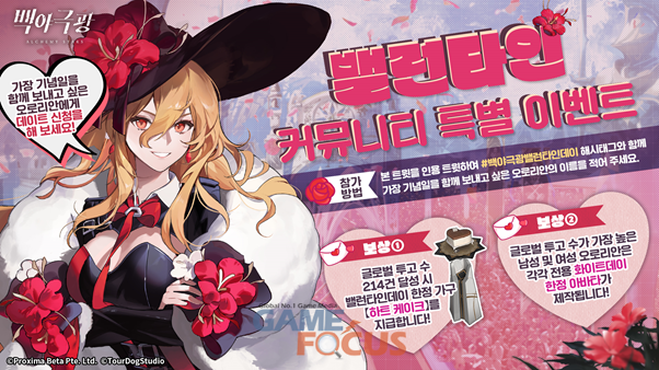 이 밖에 백야극광 공식 SNS 및 커뮤니티를 통해 가장 기념일을 함께 보내고 싶은 오로리안에게 데이트 신청을 하고 글로벌 투고 수 214건 달성 시 밸런타인데이 한정 가구 '하트 케이크'를 지급한다.