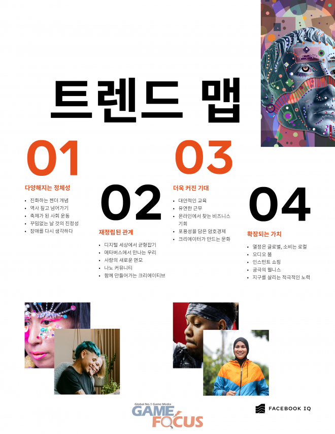이번 보고서는 한국을 비롯한 전 세계 12개 시장에서 3만6천명을 대상으로 실시한 설문조사와 페이스북과 인스타그램 등 메타 플랫폼 상에서 집계된 2020년과 2021년 해시태그 등 익명 데이터에 기반을 두고 있다. 메타는 이번 보고서에서 세상을 바라보는 참신한 방식이 미래에 소통, 창작, 소비 활동 등에 어떤 영향을 미칠지 예측하고, 주목할만한 사회문화적 변화상을 담은 주제 4가지와 관련 트렌드 20가지를 소개했다.