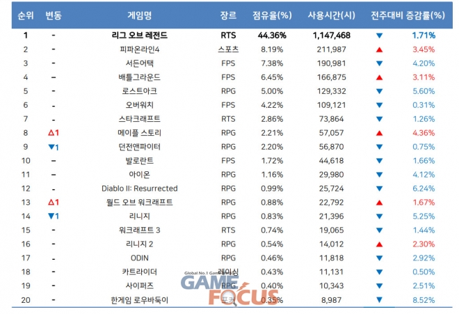 11위~20위에서도 ‘월드 오브 워크래프트’의 PC방 사용량이 전주 대비 1.67% 상승하며 1계단 오른 13위를 기록 하였다.