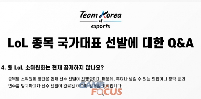 하지만, 한국e스포츠협회는 LoL 소위원회에 대한 외압이나 청탁 등의 변수를 방지하고 공정한 선발을 할 수 있도록 선수 선발이 완료된 이후에 소위원회 구성을 공개할 계획이라 밝혀 팬들의 의구심은 더욱 증폭되고 있다.
