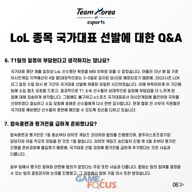 한편, 협회는 국가대표 예비명단 10인을 발표하면서 그들을 평가하기 위해 아시안게임 경기력향상위원회 산하 'LoL 소위원회'를 3월부터 구성했으며 이들과 함께 선수 선발 방식을 수립하고 각종 데이터를 기반으로 후보군을 추렸다고 밝혔다.