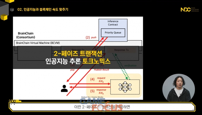 그러므로 느린 인공지능과 빠른 블록체인의 속도를 맞추는 과정이 필요하다. 브레인 체인은 이를 해결하기 위해 추론 Queue라는 개념을 도입했고, 이를 이용해 트랜잭션(쪼갤 수 없는 업무 처리의 최소 단위)을 분리하는 방법을 고안했다. 어떤 트랜잭션에서 인공지능이 요청 했을 때, 해당 요청에 대한 응답이 너무 오래 걸리므로 응답을 기다리지 않고 다음 트랜잭션으로 넘어간다. 추론 요청은 이미 인공신경망에서 구동이 되고 있고 있으며 응답이 나오면 그 응답을 다른 트랜잭션으로 담아서 요청 트랜잭션과 응답 트랜잭션을 쪼개서 만들어낸다. 이것이 2-페이즈 트랜잭션이라는 구조다.