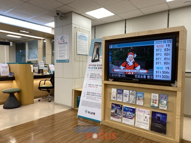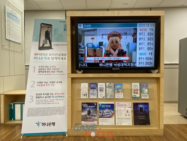 하나은행 낙성대점에서 호요버스 체크카드 발급 안내 홍보영상을 은행 내 안내 스크린에 송출하고 있다고 해 확인해 보니 실제 홍보 영상이 송출되고 있었으며 발걸음을 멈추고 영상을 지켜보는 고객도 많은 것을 확인할 수 있었다. 낙성대점이 서울대학교 학생을 비롯해 젊은 세대 비율이 높은 관악구 낙성대에 위치한 만큼 고객 니즈에 맞춘 안내가 주효한 것으로 풀이된다.