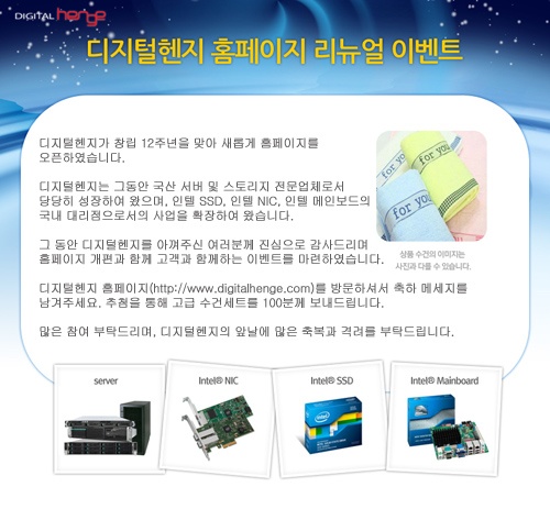 인텔 워크스테이션, 메인보드, SSD 유통사 디지털헨지는 오늘(5일), 창립 12주년을 맞이하여 홈페이지를 리뉴얼한다고 밝혔다.