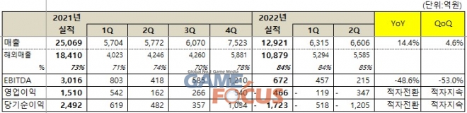 2022년 상반기 누적으로 보면 매출은 1조 2,921억 원(YoY 12.6%), EBITDA 는 672억 원(YoY -45.0%), 영업손실은 466억 원(YoY 적자전환), 당기순손실은 1,723억 원(YoY 적자전환)으로 집계됐다.