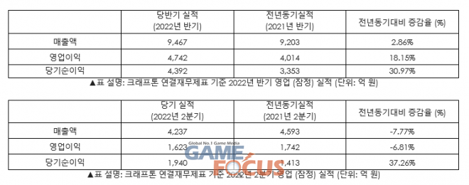 크래프톤의 2022년 상반기 실적은 한국채택국제회계기준(K-IFRS)을 적용한 연결 재무제표 기준으로 누적 매출액 9,467억원, 영업이익 4,742억원, 당기순이익 4,392억원을 기록했다.