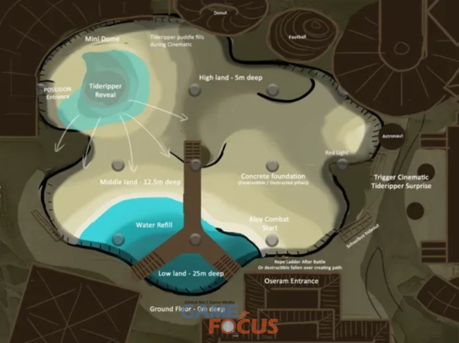 이 전투 지역은 플레이어가 실수로 구역을 떠나지 않도록 충분히 깊고 타이드리퍼가 움직일 수 있는 평평한 공간과 함께 에일로이가 빠르게 이동하기 위한 고정 지점, 추가 도전을 위해 일부는 파괴되도록 만들었다.