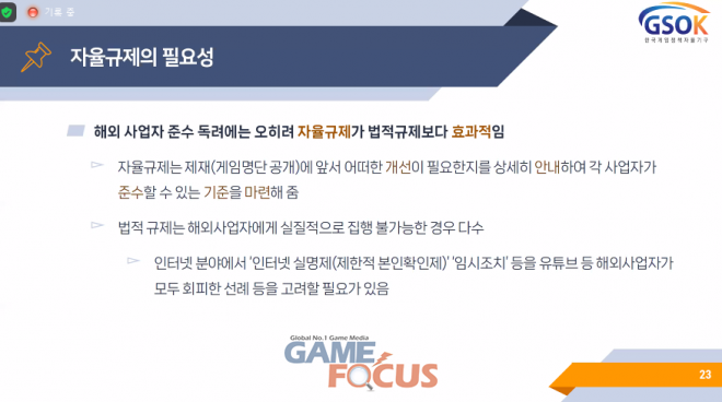 한편, 황 의장은 "자율 규제는 법적 규제보다 이용자 보호에 더 적합하다. 또한 자율 규제 강령 개정은 법률 개정보다 신속하다는 강점이 있다"며 "게임의 주기가 짧아지고 있기 때문에 법적 규제가 오히려 실효성이 낮을 가능성이 있다"고 강조했다.