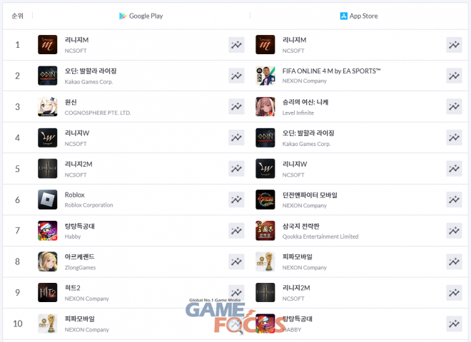 먼저 이번 주 구글 플레이에서는 '리니지M'과 '오딘: 발할라 라이징' 등 MMORPG 2파전이 벌어지고 있다. 여기에 투톱을 달리는 MMORPG의 뒤는 '원신'이 바짝 추격하고 있다.
